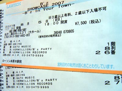 ■2007.08.08 SHOWCASE 2007 -B'z in Your Town- 栃木 宇都宮市文化会館 ネット抽選で見事に落選↓だからヤフオク7列目♪